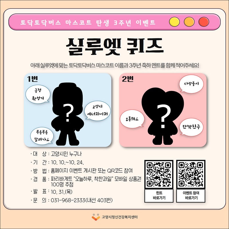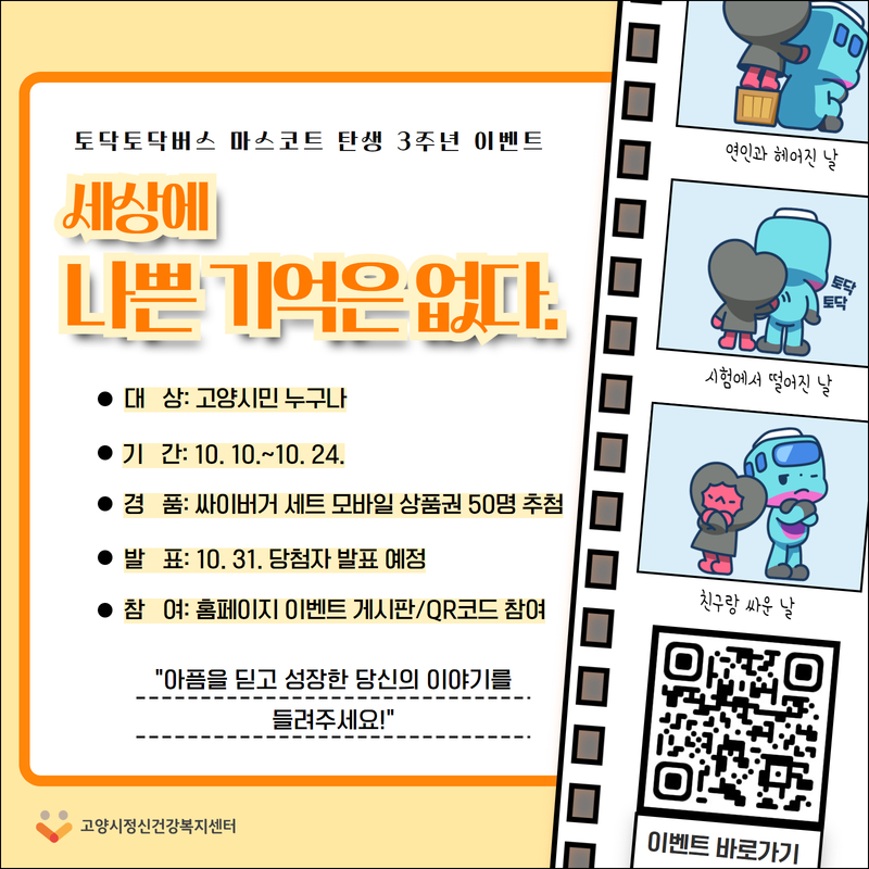 [고양시정신건강복지센터] 토닥토닥버스 마스코트 토리, 하리 탄생 3주년 이벤트 홍보 페이지 정보 작성자 원흥종합사회복지관 댓글 0건 조회728회 작성일 24-10-15 14:18 목록 본문 이전글[서울시립북부장애인종합복지관] 장애 인권 공모전 '세상을 만나는 또 하나의 길' 24.10.15 다음글2024년 맑은장애인자립생활센터 사업 홍보 24.07.04 댓글 0개 댓글목록 등록된 댓글이 없습니다.