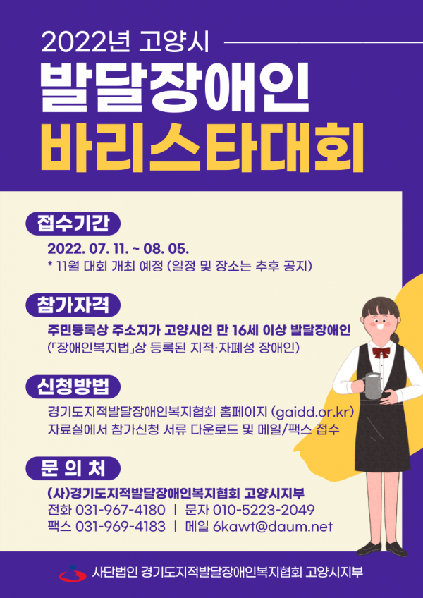 2022년 고양시 발달장애인 바리스타대회 페이지 정보 작성자 관리자 댓글 0건 조회853회 작성일 22-07-12 16:38 목록 본문 이전글[고양시건강가정지원센터] 2022년 조부모교육 프로그램 홍보 22.07.13 다음글[고양시정신건강복지센터] 뇌부자들의 온라인 토크 콘서트 22.06.27 댓글 0개 댓글목록 등록된 댓글이 없습니다.