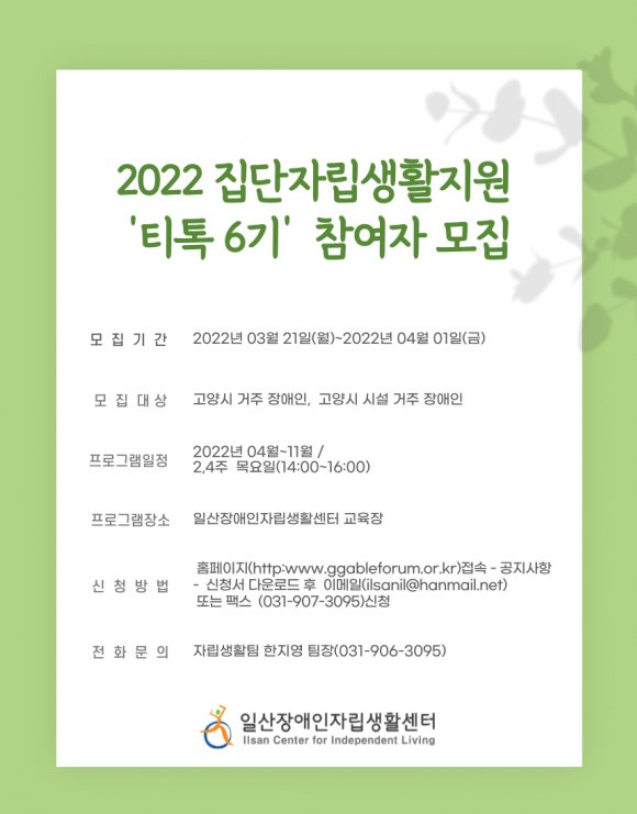 [일산장애인자립생활센터] 집단자립생활지원 참여자 모집 페이지 정보 작성자 관리자 댓글 0건 조회836회 작성일 22-04-11 19:05 목록 본문 이전글[일산장애인자립생활센터] 보장구 수리지원 신청자 모집 22.04.29 다음글[일산서구햇빛촌장애인자립생활센터] 장애인 맞춤형 공공일자리 참여자모집 22.04.11 댓글 0개 댓글목록 등록된 댓글이 없습니다.