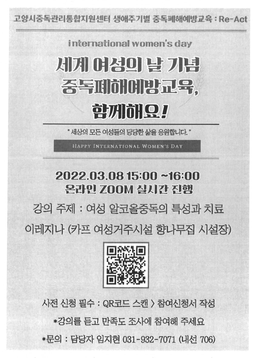 [고양시중독관리통합지원센터] 중독폐해예방교육 참여안내 페이지 정보 작성자 관리자 댓글 0건 조회822회 작성일 22-03-03 10:07 목록 본문 이전글[서민금융진흥원] 금융상담 22.03.04 다음글[일산장애인자립생활센터] 발달장애인 자조모임 '키보드' 회원모집 22.02.23 댓글 0개 댓글목록 등록된 댓글이 없습니다.