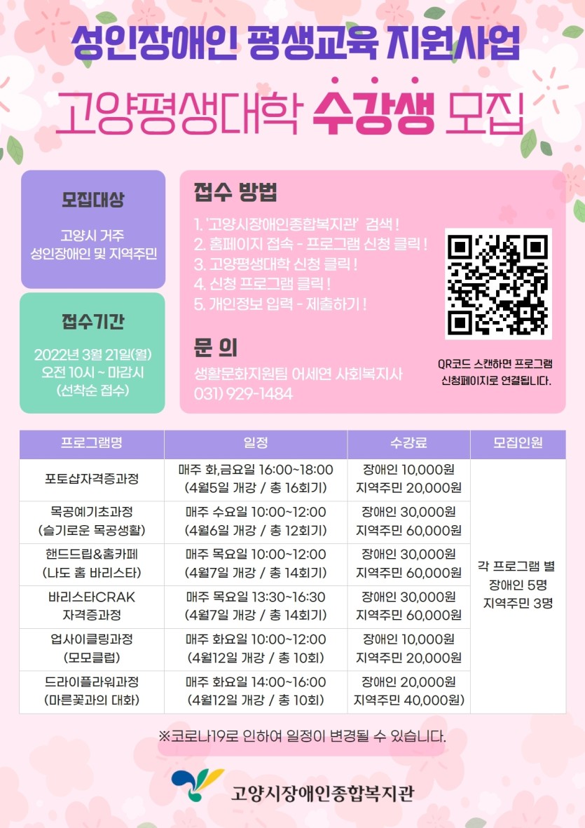 [고양시장애인복지관] 고양평생대학 수강생 모집 페이지 정보 작성자 관리자 댓글 0건 조회864회 작성일 22-03-16 15:56 목록 본문 이전글[자원봉사 애원] 2022년 용평리조트 숙박권 지원사업 22.03.16 다음글고양시·LH 주거위기가구 임시거처 '나눔주택' 운영 및 道 청년기본소득 접수 22.03.14 댓글 0개 댓글목록 등록된 댓글이 없습니다.