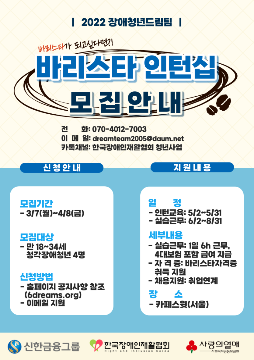 바리스타 인턴쉽 모집안내 페이지 정보 작성자 관리자 댓글 0건 조회878회 작성일 22-03-16 16:26 목록 본문 이전글[고양시자살예방센터] 고양시 청년자살예방 청년서포터즈 3기 모집 22.03.16 다음글[자원봉사 애원] 2022년 용평리조트 숙박권 지원사업 22.03.16 댓글 0개 댓글목록 등록된 댓글이 없습니다.