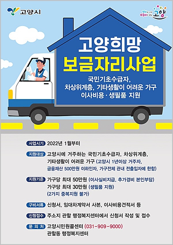 고양시가 취약계층의 주거환경 개선과 생활안정을 도모하기 위해 이사비용 및 생필품을 지원하는 고양희망보금자리’ 사업을 추진한다.