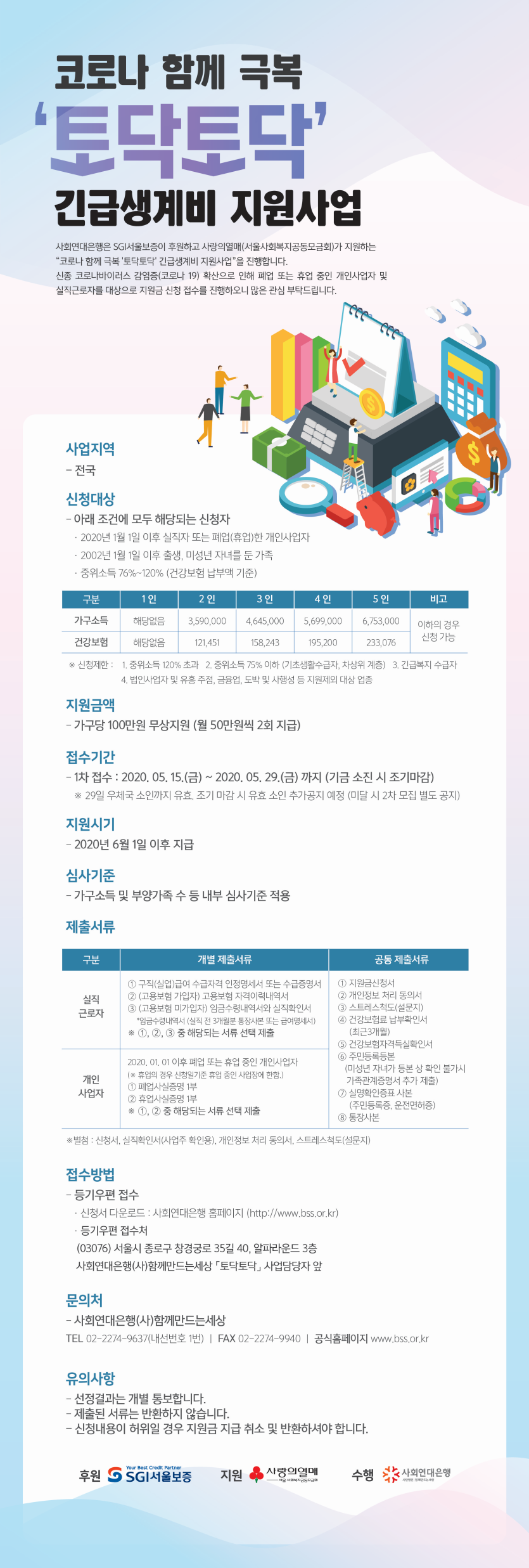사회연대은행에서 신종 코로나바이러스 감염증(코로나 19) 확산으로 인해 폐업 또는 휴업 중인 개인사업자 및 실직근로자를 대상으로 "코로나 함께 극복 '토닥토닥' 긴급생계비 지원사업"의 신청 접수를 진행하오니 많은 관심바랍니다.