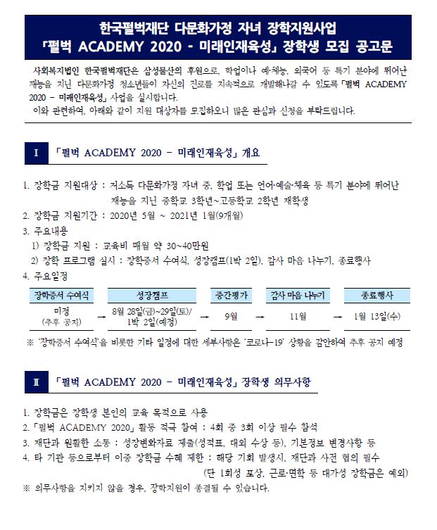 한국펄벅재단 다문화가정 자녀 장학지원사업 "펄벅 ACADEMY 2020" 안내