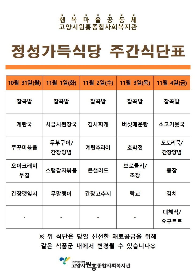 일반 11월 1째주 정성가득식당 식단 안내 페이지 정보 작성자 관리자 댓글 0건 조회1,444회 작성일 22-10-28 17:16 목록 본문 이전글이태원 참사에 애도를 표합니다. 22.10.31 다음글<긴급> 직원(취사원) 채용 재공고 22.10.28 댓글 0개 댓글목록 등록된 댓글이 없습니다.