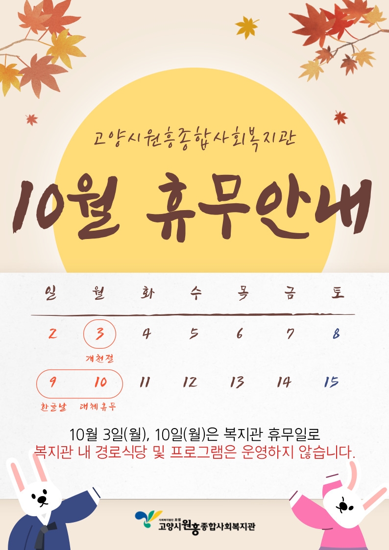 일반 10월 복지관 휴무 안내 페이지 정보 작성자 관리자 댓글 0건 조회1,883회 작성일 22-09-30 18:53 목록 본문 이전글2022년 2학기 사회복지 현장실습 최종 합격자 공지 22.08.19 다음글2022년 추석맞이 한가위행사 '만들다, 나누다, 함께하다 <만나다>' 진행 안내 22.08.31 댓글 0개 댓글목록 등록된 댓글이 없습니다.