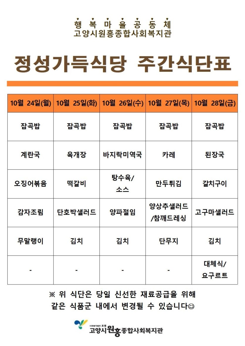일반 10월 4째주 정성가득식당 식단 안내 페이지 정보 작성자 관리자 댓글 0건 조회1,348회 작성일 22-10-24 09:39 목록 본문 이전글2022년도 식자재 납품업체 선정 결과 22.10.26 다음글10월 3째주 정성가득식당 식단 안내 22.10.19 댓글 0개 댓글목록 등록된 댓글이 없습니다.