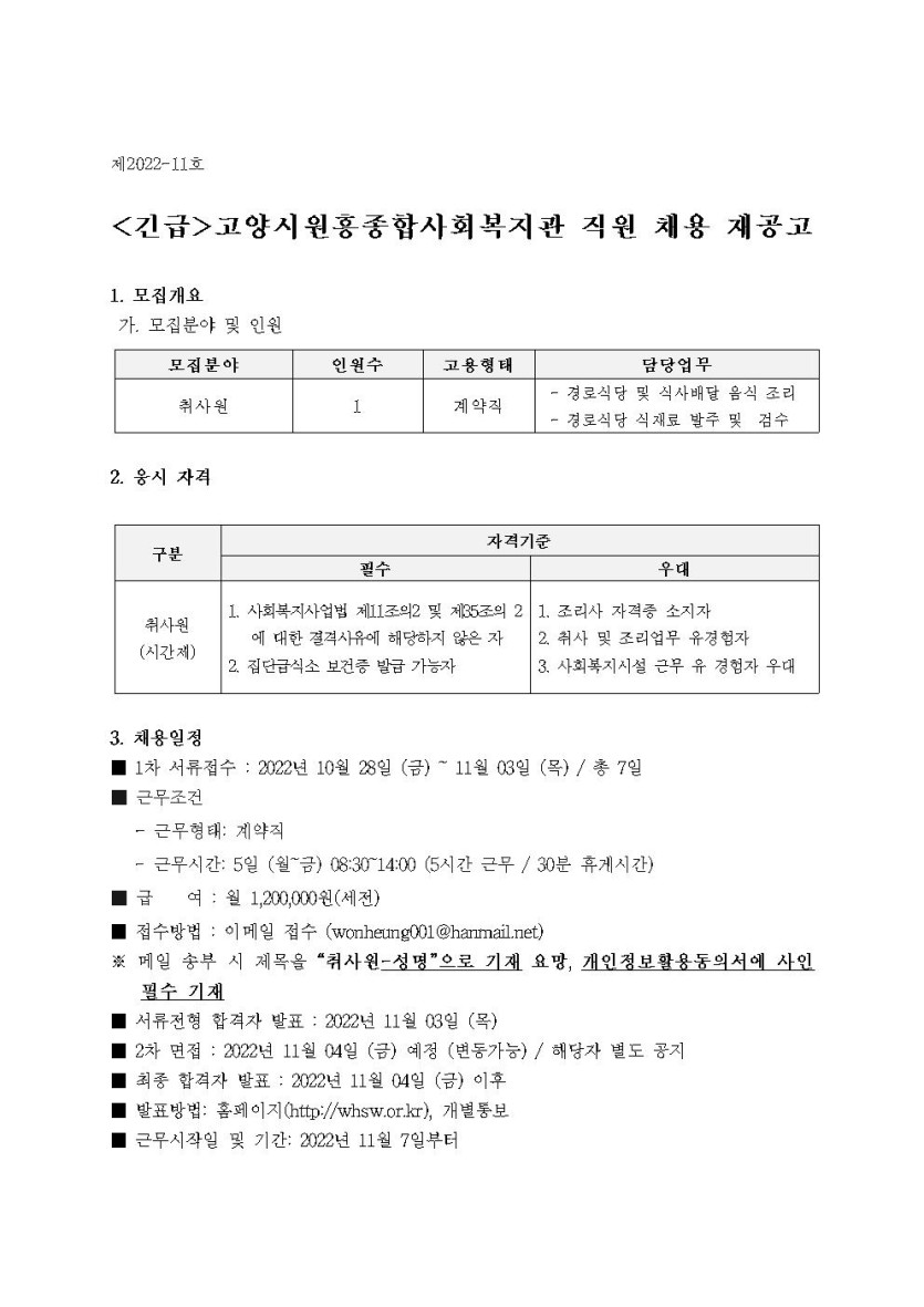 채용공고 <긴급> 직원(취사원) 채용 재공고 페이지 정보 작성자 관리자 댓글 0건 조회1,323회 작성일 22-10-28 14:23 목록 본문 첨부파일 입사지원서 양식_최종.hwp (32.0K) 입사지원서 양식_최종.hwp (32.0K) 이전글11월 1째주 정성가득식당 식단 안내 22.10.28 다음글2022년도 식자재 납품업체 선정 결과 22.10.26 댓글 0개 댓글목록 등록된 댓글이 없습니다.