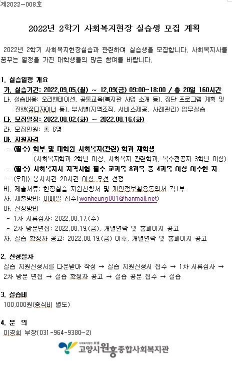 채용공고 2022년 2학기 사회복지현장실습생 모집 공고 페이지 정보 작성자 관리자 댓글 0건 조회1,758회 작성일 22-08-02 00:35 목록 본문 이전글고양시원흥종합사회복지관의 생일을 맞춰주세요! 22.04.20 다음글직원(사회복지사) 채용 공고 22.08.29 댓글 0개 댓글목록 등록된 댓글이 없습니다.