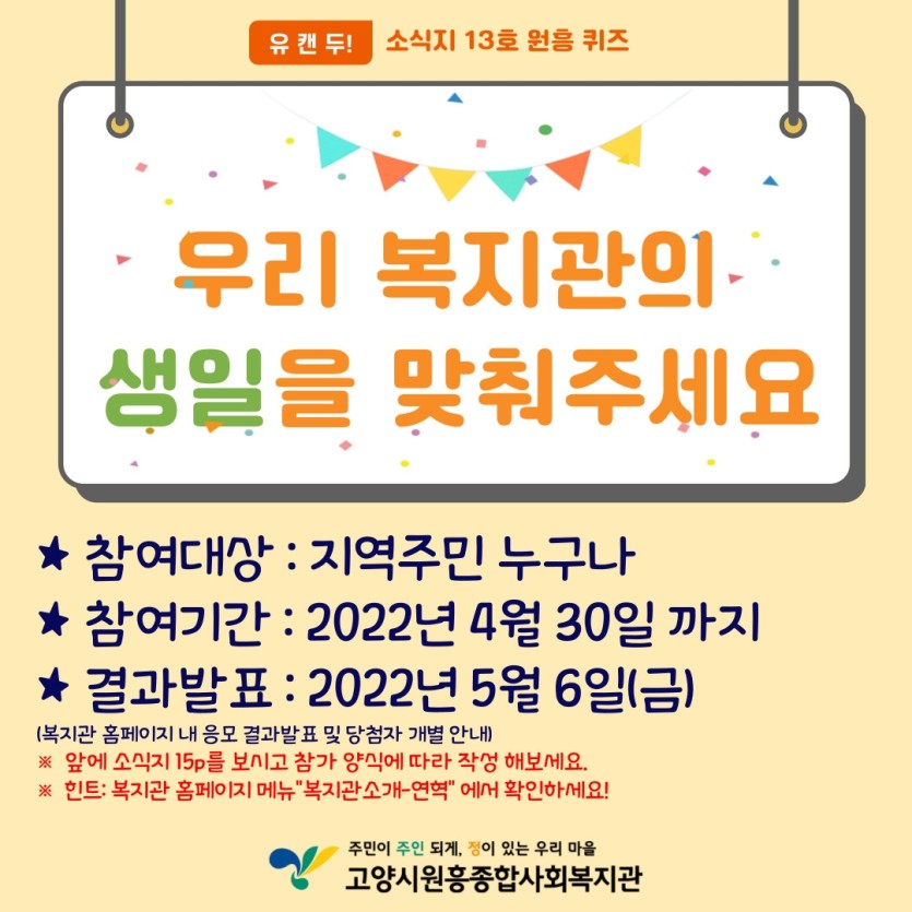 일반 고양시원흥종합사회복지관의 생일을 맞춰주세요! 페이지 정보 작성자 관리자 댓글 0건 조회1,933회 작성일 22-04-20 18:30 목록 본문 이전글2022년 가정의달 행사 "흥나는마을탐사대" 참여안내 22.05.09 다음글2022년 2학기 사회복지현장실습생 모집 공고 22.08.02 댓글 0개 댓글목록 등록된 댓글이 없습니다.
