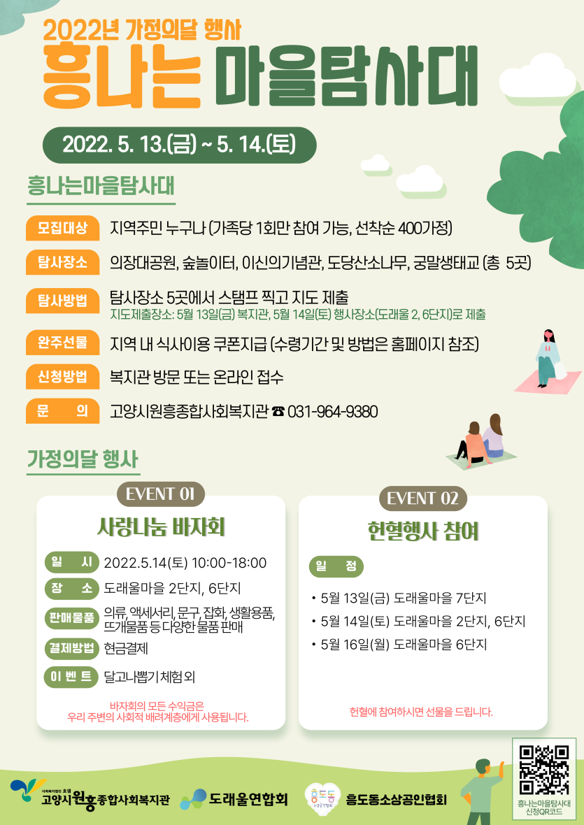 흥나는마을탐사대(5월 13일(금)~14일(토))와 사랑나눔 바자회(5월 14일(토))가 진행될 예정이오니,