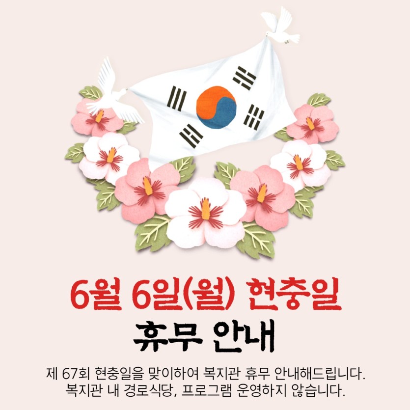 일반 2022년 6월 6일 현충일 휴무 안내 페이지 정보 작성자 관리자 댓글 0건 조회1,836회 작성일 22-06-03 18:13 목록 본문 이전글2022년 평생교육 강사 최종 합격자 공지 22.04.01 다음글사회복지관의 날(5월 21일) 22.05.09 댓글 0개 댓글목록 등록된 댓글이 없습니다.