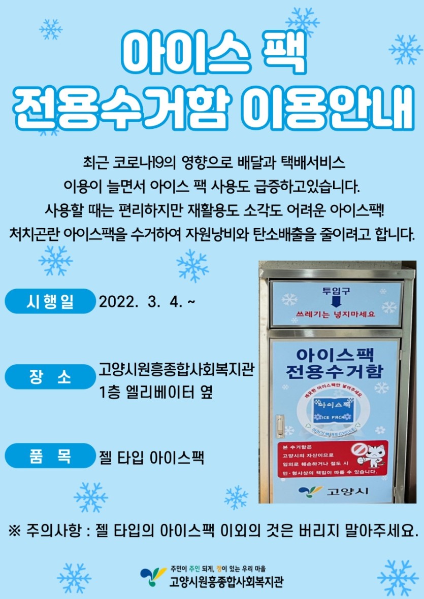 일반 복지관 아이스팩 전용수거함 이용안내 페이지 정보 작성자 관리자 댓글 0건 조회1,856회 작성일 22-03-21 18:18 목록 본문 이전글고양시원흥종합사회복지관 카카오톡 채널 추가 안내 22.02.21 다음글2022년 평생교육프로그램 강사 채용 공고 22.03.21 댓글 0개 댓글목록 등록된 댓글이 없습니다.