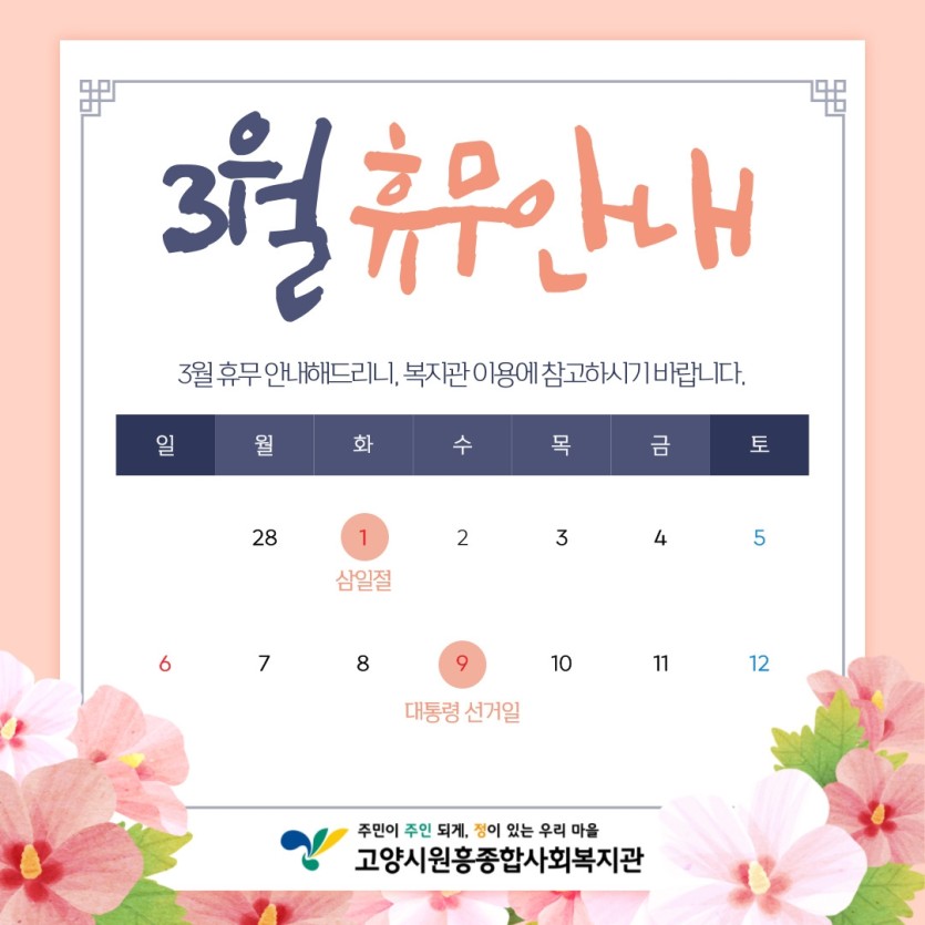 일반 2022년 3월 휴무 안내 페이지 정보 작성자 관리자 댓글 0건 조회1,816회 작성일 22-02-28 12:48 목록 본문 이전글2022년 경기복지재단 지원"경기 어르신 즐김터 수행기관" 최종선정 22.03.11 다음글2022년 설날맞이 윷놀이 이벤트 22.01.25 댓글 0개 댓글목록 등록된 댓글이 없습니다.