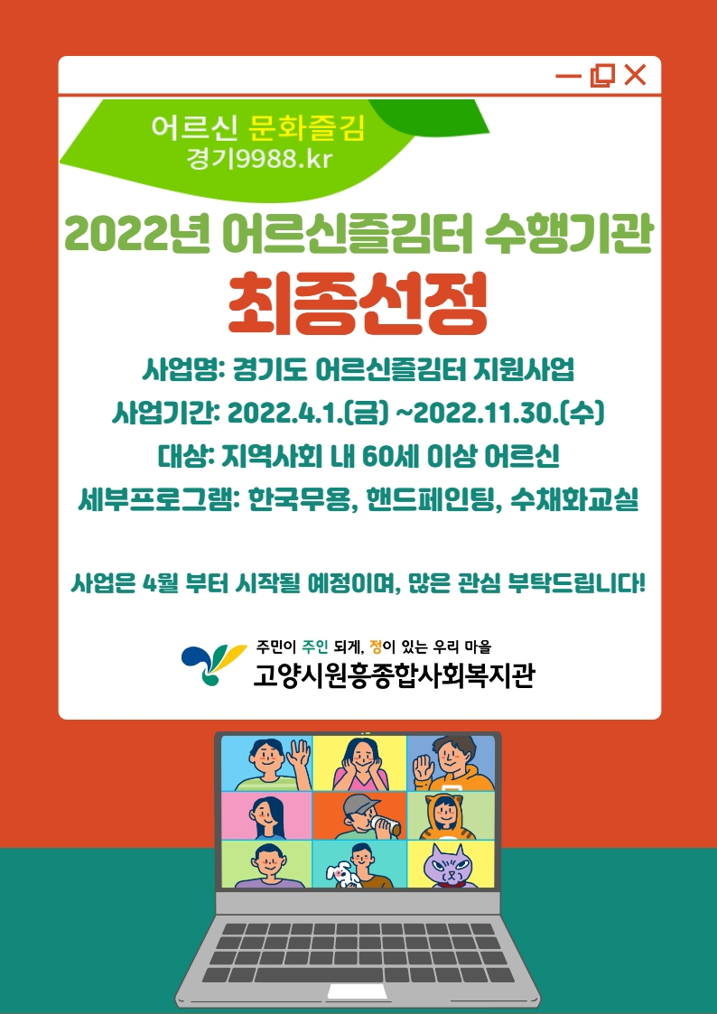 채용공고 2022년 경기복지재단 지원"경기 어르신 즐김터 수행기관" 최종선정 페이지 정보 작성자 관리자 댓글 0건 조회1,728회 작성일 22-03-11 09:56 목록 본문 이전글2022년 장애인일자리사업 직무지도원 채용 서류전형 합격자 공지 21.12.27 다음글2022년 3월 휴무 안내 22.02.28 댓글 0개 댓글목록 등록된 댓글이 없습니다.