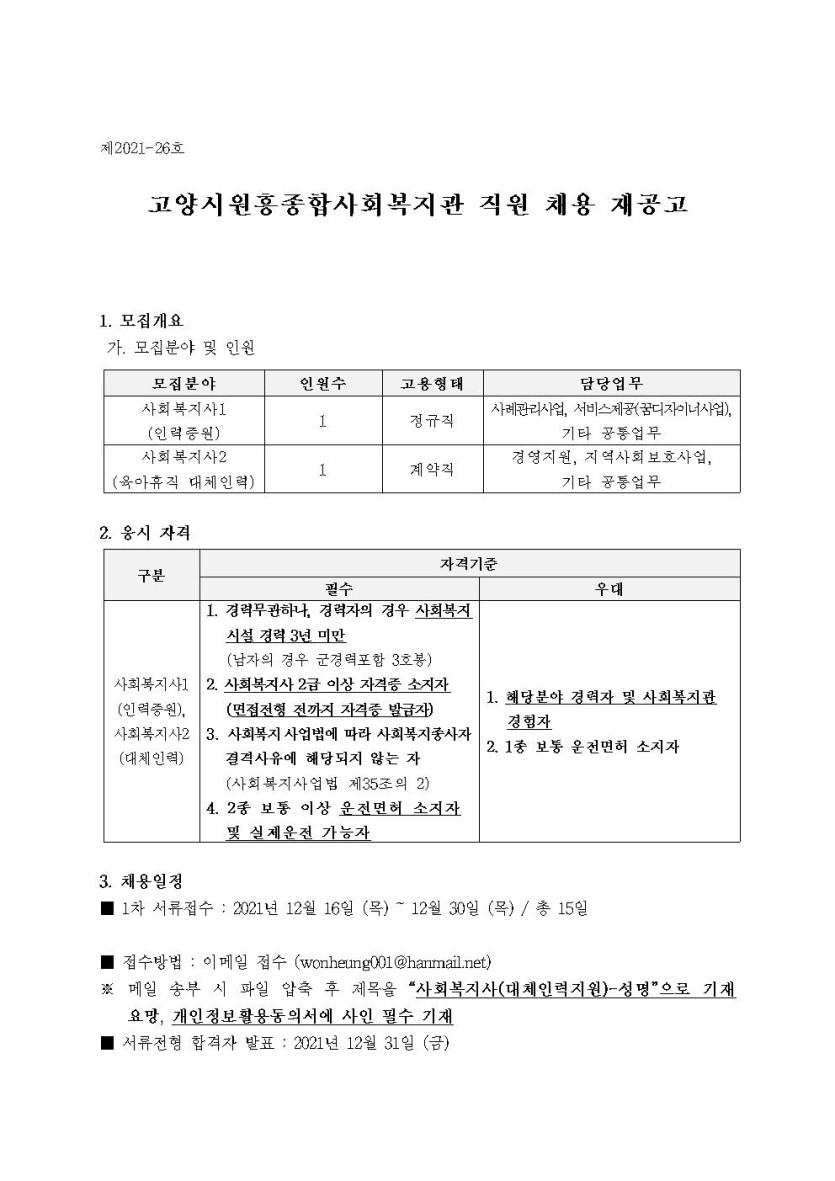 채용공고 [재공고] 직원(사회복지사, 육아휴직 대체인력) 채용 공고 페이지 정보 작성자 관리자 댓글 0건 조회2,041회 작성일 21-12-16 12:06 목록 본문 이전글2022 고양 청년 희망일자리사업-식사배달 사업 청년인턴채용공고 21.12.20 다음글직원(사회복지사, 대체인력)채용 최종합격자 공지 22.01.05 댓글 0개 댓글목록 등록된 댓글이 없습니다.