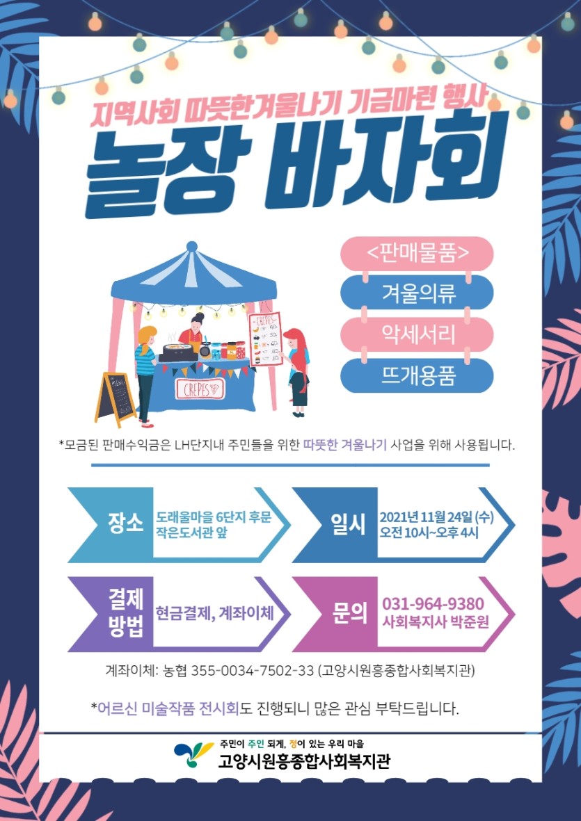 일반 2021년 따뜻한 겨울나기 기금마련 행사 바자회 <놀장> 페이지 정보 작성자 관리자 댓글 0건 조회1,822회 작성일 21-11-19 18:28 목록 본문 이전글2021년 고양시원흥종합사회복지관 2차 추가경정예산 공고 21.11.29 다음글코로나19 단계적 일상회복을 위한 복지관 운영사항 안내 21.11.19 댓글 0개 댓글목록 등록된 댓글이 없습니다.