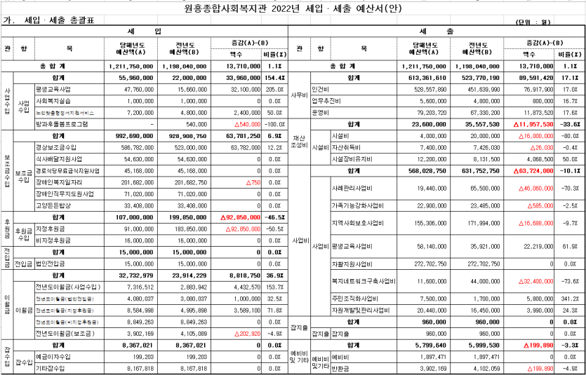 본 고양시원흥종합사회복지관은 사회복지법인 및 사회복지시설 재무회계규칙 제10조(예산의 편성 및 결정절차) 3항에 의거하여 2022년 고양시원흥종합사회복지관 예산을 공고합니다.