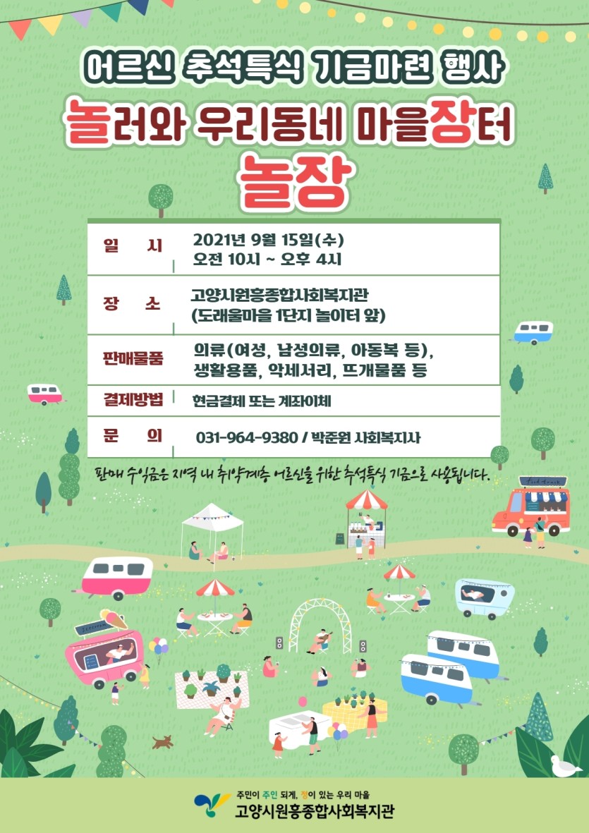 일반 2021년 추석맞이 특식 기금마련행사 <놀러와 우리동네 마을장터 놀장> 진행 페이지 정보 작성자 관리자 댓글 0건 조회1,831회 작성일 21-09-08 19:23 목록 본문 이전글직원채용 1차 서류전형 합격자 공지 21.09.14 다음글추석연휴안내 21.09.16 댓글 0개 댓글목록 등록된 댓글이 없습니다.