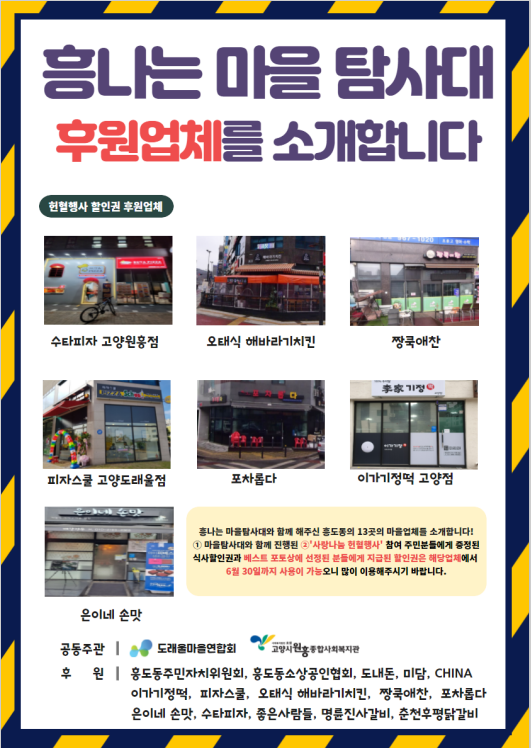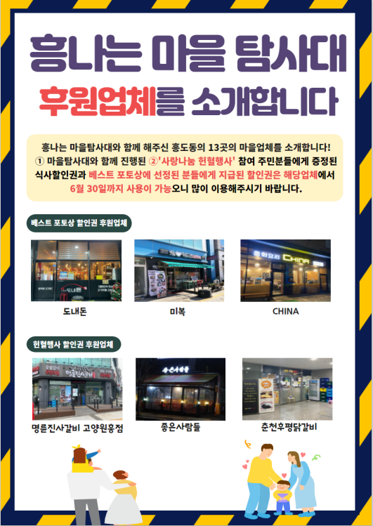일반 [흥나는 마을탐사대] 식사할인권 이용가능 업체 소개드립니다! 페이지 정보 작성자 관리자 댓글 0건 조회1,854회 작성일 21-06-01 18:16 목록 본문 이전글2021년 하계방학 사회복지현장 실습생 모집 21.06.10 다음글흥나는 마을탐사대 BEST포토후기 발표 21.06.01 댓글 0개 댓글목록 등록된 댓글이 없습니다.