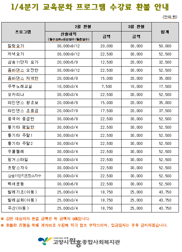 일반 1/4분기 교육문화 프로그램 수강료 환불금 안내 페이지 정보 작성자 관리자 댓글 0건 조회1,821회 작성일 20-03-19 18:42 목록 본문 이전글코로나19 예방 <우리 함께 이겨낼 수 있습니다!> 20.03.20 다음글코로나19 마음방역 캠페인 - 이벤트 1탄, 아이사랑 손씻기 20.03.26 댓글 0개 댓글목록 등록된 댓글이 없습니다.