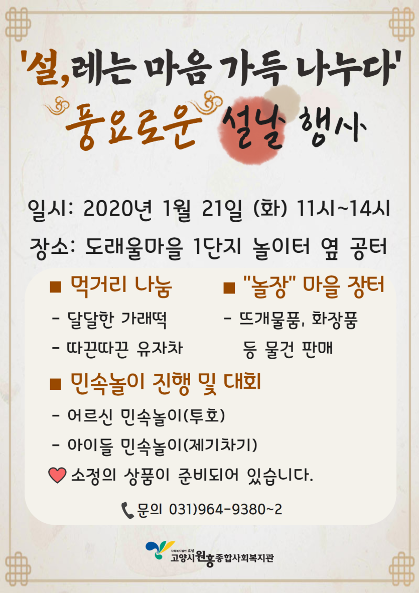 일반 2020년 설 행사 설, 레는 마음 가득 나누다' 페이지 정보 작성자 관리자 댓글 0건 조회1,729회 작성일 20-01-17 17:33 목록 본문 이전글정성가득식당 1월 5주 식단 안내 20.01.23 다음글2020년 동계방학 사회복지현장실습 최종합격자 공지 20.01.16 댓글 0개 댓글목록 등록된 댓글이 없습니다.