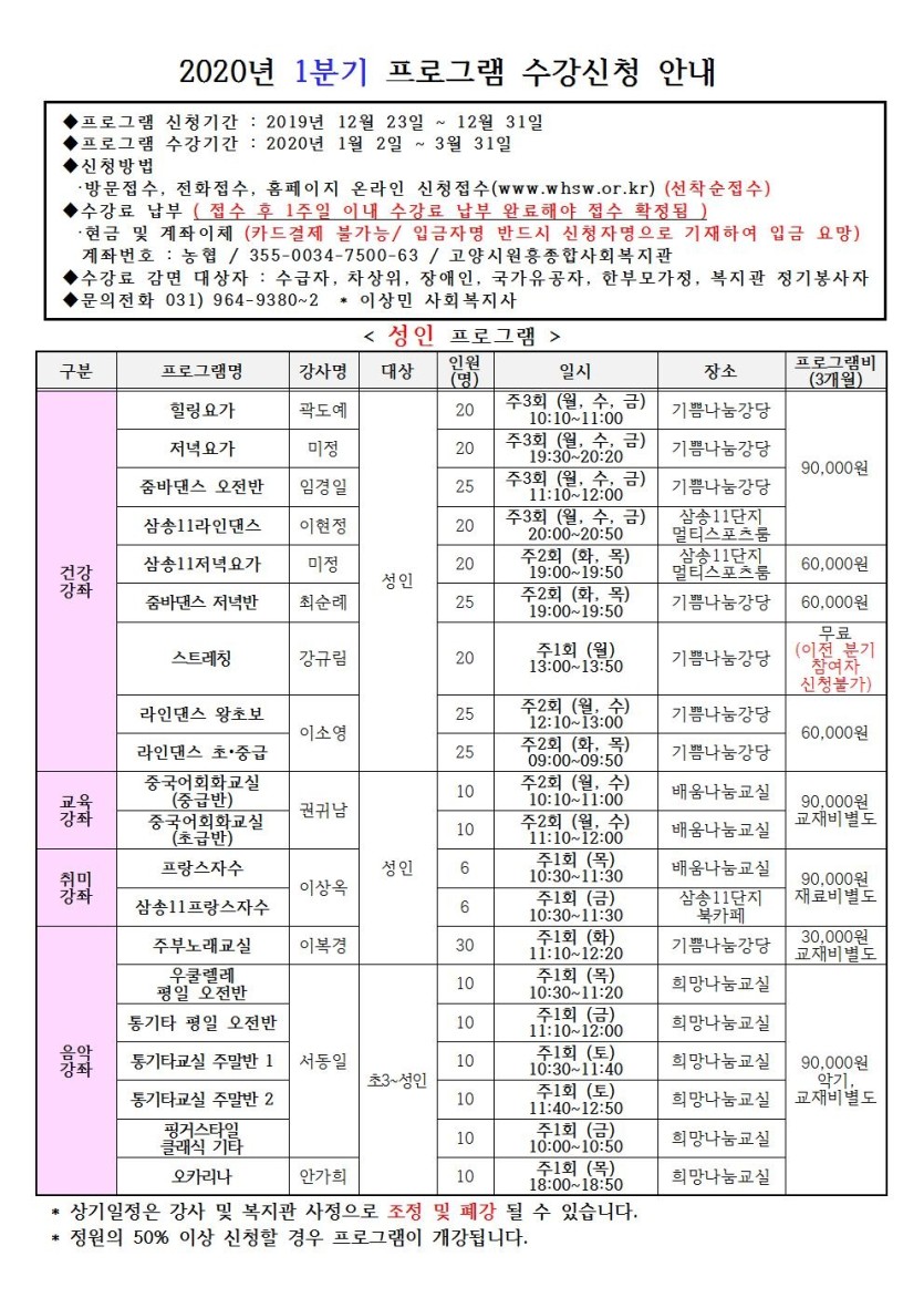 일반 2020년 1분기 교육문화프로그램 홍보 페이지 정보 작성자 관리자 댓글 0건 조회1,938회 작성일 19-12-18 09:55 목록 본문 이전글경력직 사회복지사 최종합격자 공지 19.12.20 다음글경력직 사회복지사 채용 서류전형 합격자 공지 19.12.17 댓글 0개 댓글목록 등록된 댓글이 없습니다.
