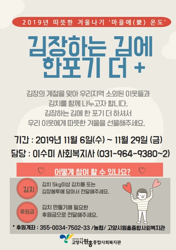 일반 김장김치 나눔으로 따뜻한 겨울을 선물해주세요!^^ 페이지 정보 작성자 관리자 댓글 0건 조회1,805회 작성일 19-11-07 11:50 목록 본문 이전글행복웃음가득치료센터 인지치료사 및 상담사 채용 공고 19.11.07 다음글고양시 행신3동, 흥도동 민·관 연합사례발표회 신청 안내 19.11.06 댓글 0개 댓글목록 등록된 댓글이 없습니다.