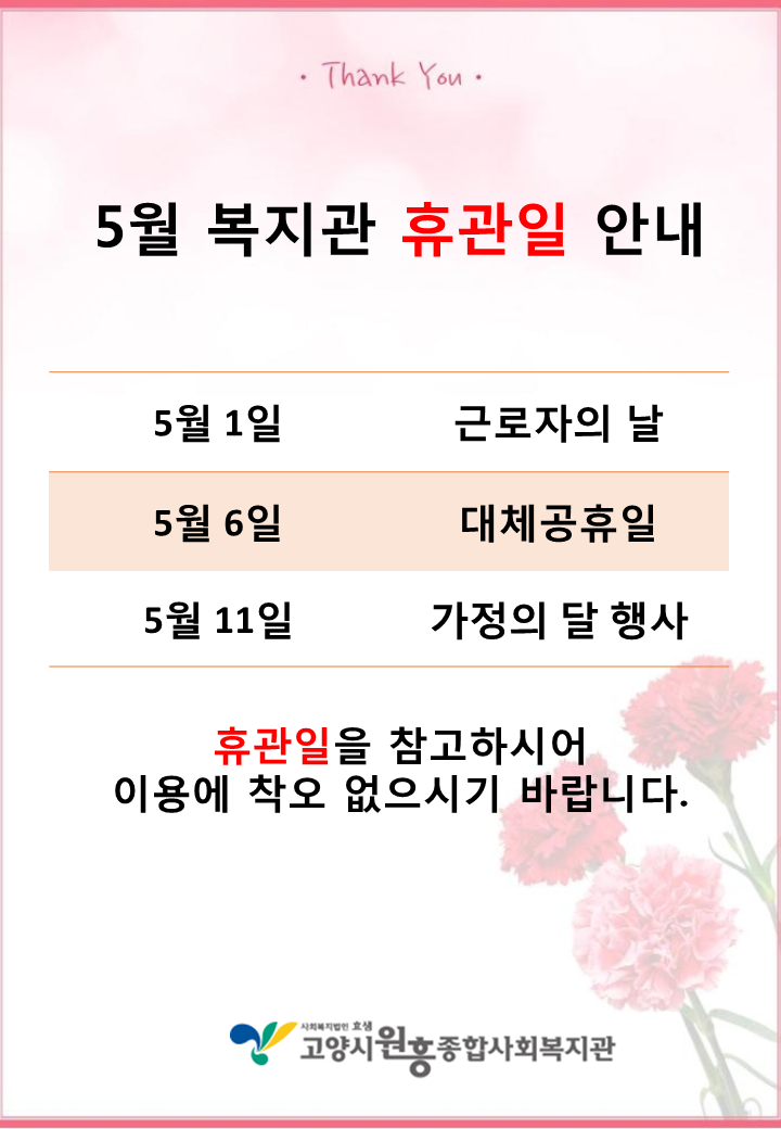 일반 5월 휴관일 안내 페이지 정보 작성자 관리자 댓글 0건 조회1,877회 작성일 19-04-29 10:41 목록 본문 이전글서비스제공팀 사회복지사(정규직) 채용 공고 19.05.07 다음글[재공고] 고양시원흥종합사회복지관 사회복지사(정규직) 채용 공고 19.06.03 댓글 0개 댓글목록 등록된 댓글이 없습니다.