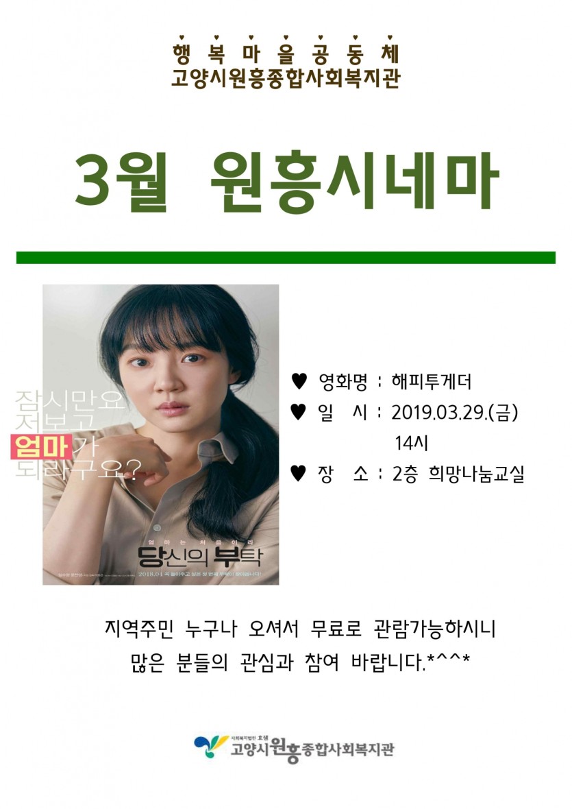 일반 3월 원흥시네마 안내 페이지 정보 작성자 관리자 댓글 0건 조회1,893회 작성일 19-03-23 11:55 목록 본문 이전글1분기 교육문화프로그램 만족도조사 참여 안내 19.03.26 다음글4월 원흥시네마 안내 19.04.23 댓글 0개 댓글목록 등록된 댓글이 없습니다.