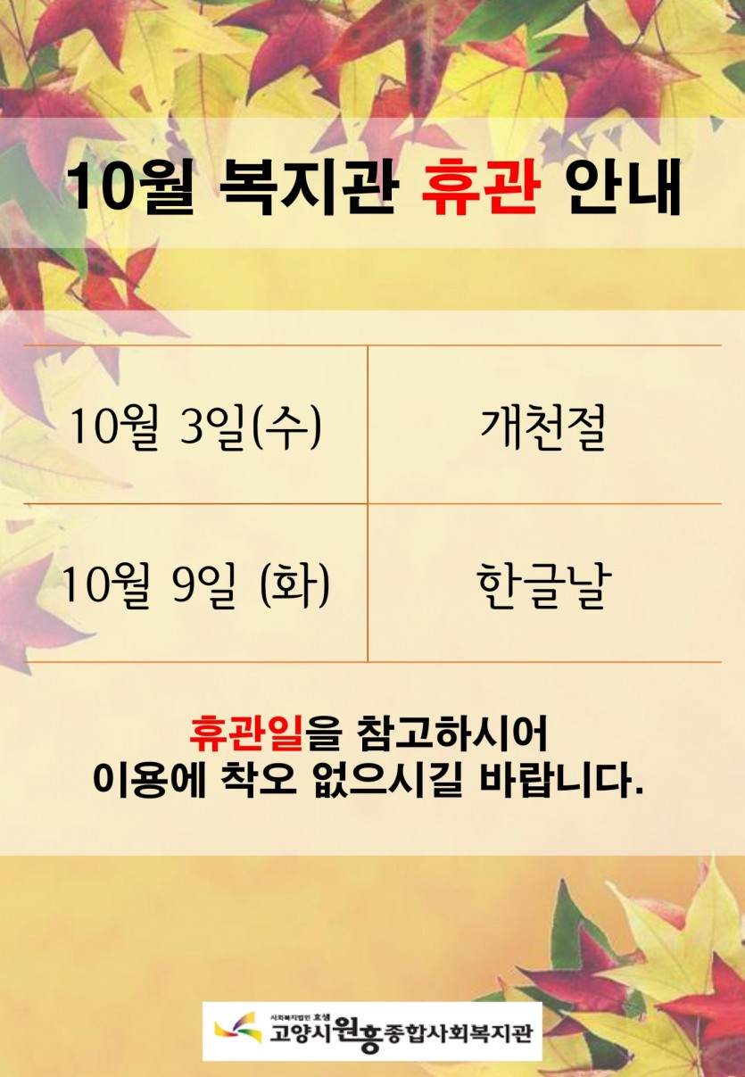 일반 10월 복지관 휴관일 안내 페이지 정보 작성자 관리자 댓글 0건 조회1,812회 작성일 18-10-02 18:17 목록 본문 이전글2018년 제8회「푸른고양 나눔장터」 18.10.08 다음글9월 원흥시네마 안내 18.09.17 댓글 0개 댓글목록 등록된 댓글이 없습니다.
