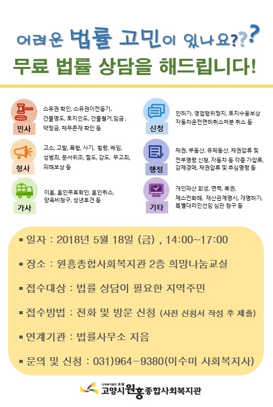일반 무료법률상담 진행 페이지 정보 작성자 관리자 댓글 0건 조회1,781회 작성일 18-05-16 09:35 목록 본문 이전글5월 원흥시네마 '어떤 시선' 영화 상영 18.05.21 다음글8월 무료법률상담 진행 안내 18.08.01 댓글 0개 댓글목록 등록된 댓글이 없습니다.