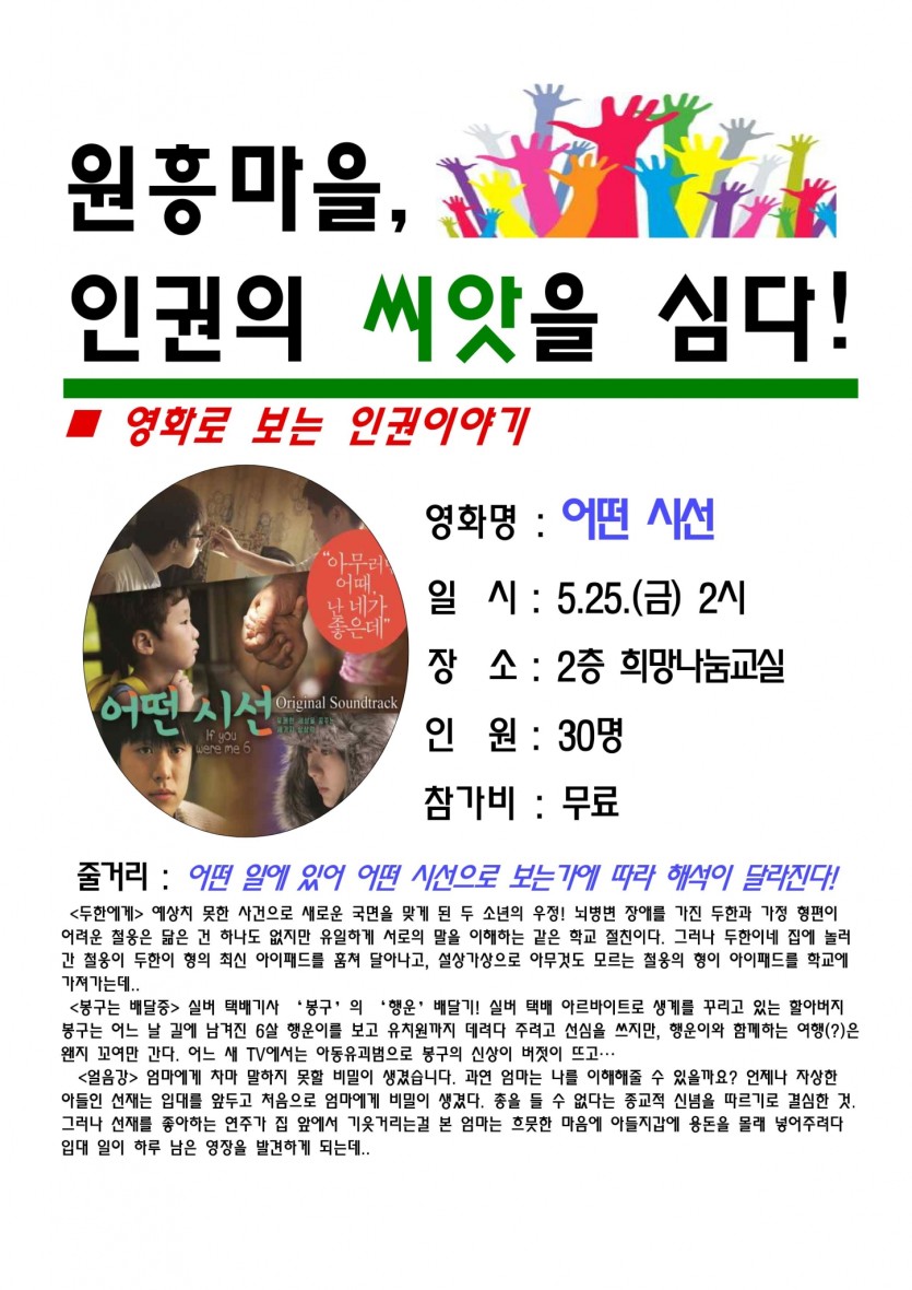 일반 5월 원흥시네마 '어떤 시선' 영화 상영 페이지 정보 작성자 관리자 댓글 0건 조회1,803회 작성일 18-05-21 16:55 목록 본문 이전글2018 가정의달 행사 흥도.도래울 돗자리 문화제 "Oh!!!흥 난 Day" 감사인사 18.05.23 다음글무료법률상담 진행 18.05.16 댓글 0개 댓글목록 등록된 댓글이 없습니다.