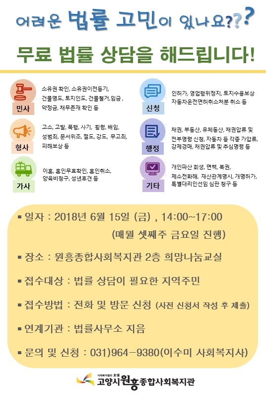일반 6월 무료법률상담 진행 안내 페이지 정보 작성자 관리자 댓글 0건 조회1,790회 작성일 18-05-30 11:27 목록 본문 이전글개인정보보호 교육 안내 18.06.04 다음글6월 복지관 휴관 안내 18.05.28 댓글 0개 댓글목록 등록된 댓글이 없습니다.