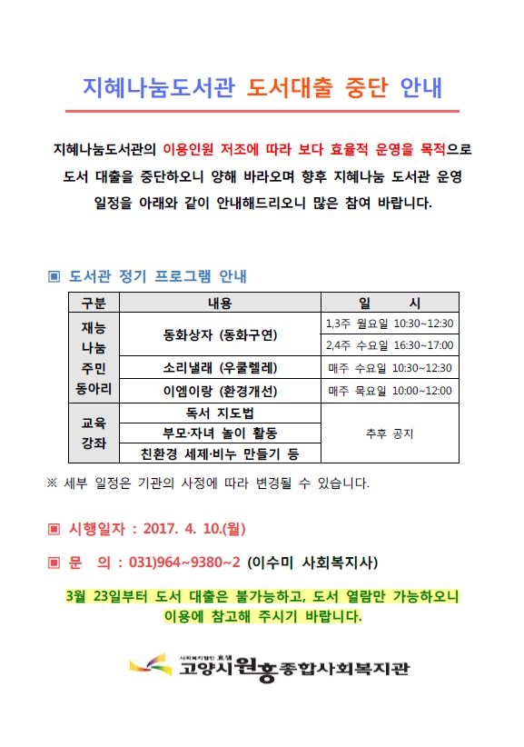 일반 지혜나눔도서관 도서대출 중단 안내 페이지 정보 작성자 관리자 댓글 0건 조회1,840회 작성일 17-03-28 13:13 목록 본문 이전글2분기(4~6월) 원흥시네마 영화 안내 17.03.29 다음글3월 원흥시네마 안내 17.03.15 댓글 0개 댓글목록 등록된 댓글이 없습니다.