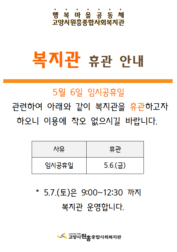 일반 5월 6일 임시공휴일에 따른 복지관 휴관 안내 페이지 정보 작성자 관리자 댓글 0건 조회1,954회 작성일 16-05-04 13:31 목록 본문 이전글정신건강 상담 실시 16.05.04 다음글개관1주년 행사 가족걷기대회 후기를 남겨주세요. 16.04.22 댓글 0개 댓글목록 등록된 댓글이 없습니다.