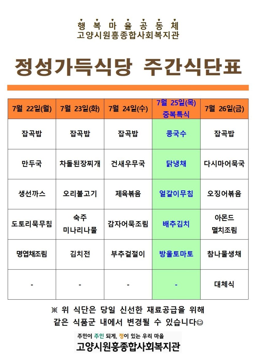 일반 7월 4째주 정성가득식당 식단 안내 페이지 정보 작성자 관리자 댓글 0건 조회1,797회 작성일 24-07-19 11:46 목록 본문 이전글5월 1째주 정성가득식당 식단 안내 24.05.03 다음글7월 3째주 정성가득식당 식단 안내 24.07.10 댓글 0개 댓글목록 등록된 댓글이 없습니다.