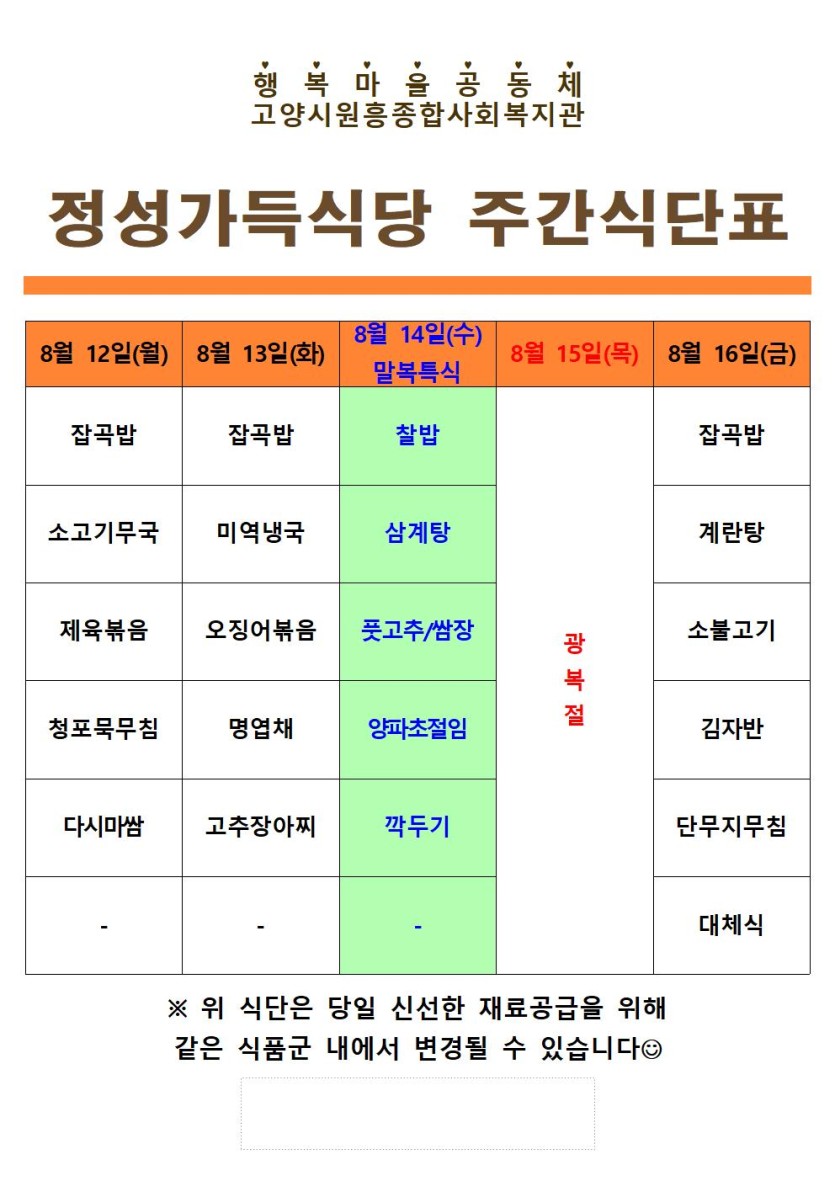 일반 8월 2째주 정성가득식당 식단 안내 페이지 정보 작성자 원흥종합사회복지관 댓글 0건 조회1,880회 작성일 24-08-09 18:44 목록 본문 8월 2째주 정성가득식당 식단 안내 이전글2024년 장애인복지일자리 참여자 추가 모집 안내 24.08.12 다음글8월 1째주 정성가득식당 식단 안내 24.08.07 댓글 0개 댓글목록 등록된 댓글이 없습니다.