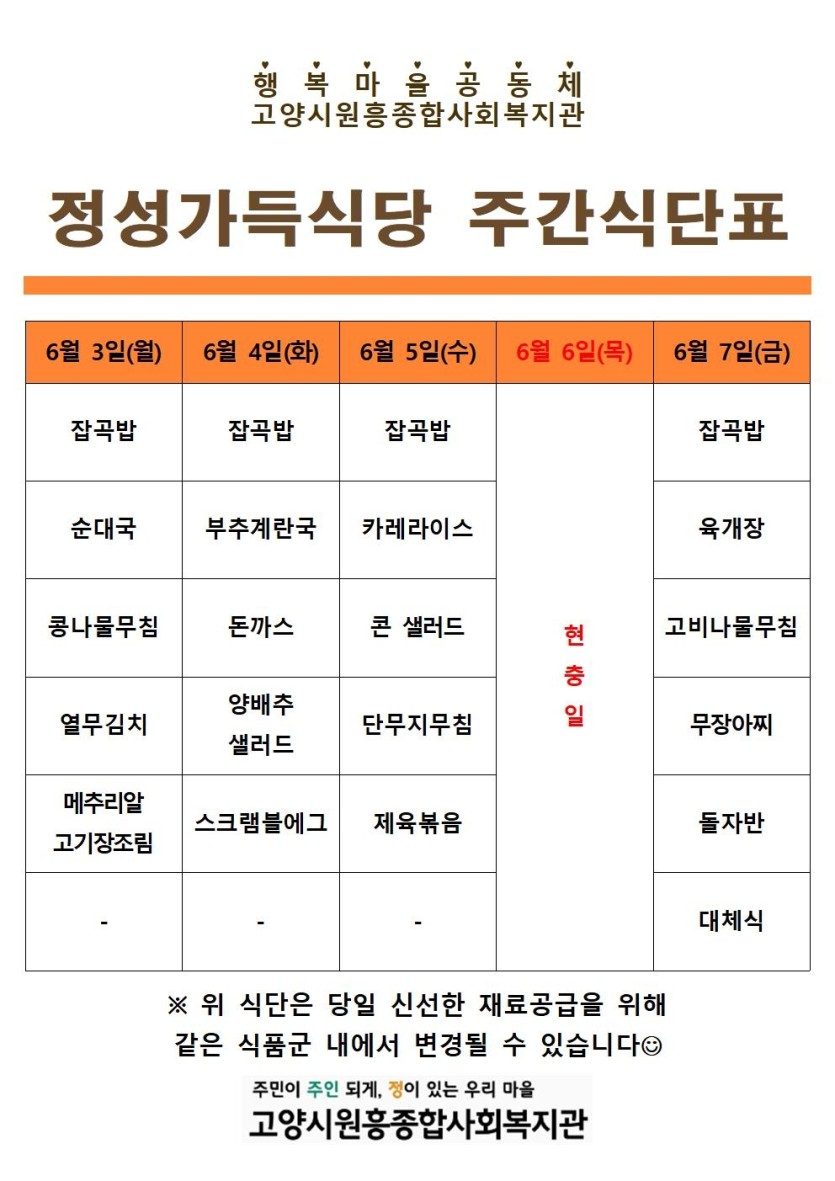 일반 6월 1째주 정성가득식당 식단 안내 페이지 정보 작성자 관리자 댓글 0건 조회1,811회 작성일 24-05-29 16:02 목록 본문 이전글2024년 하계 사회복지 현장실습 최종 합격자 공지 24.05.30 다음글2024년 하계방학 사회복지 현장실습 서류전형 합격자 공지 24.05.29 댓글 0개 댓글목록 등록된 댓글이 없습니다.