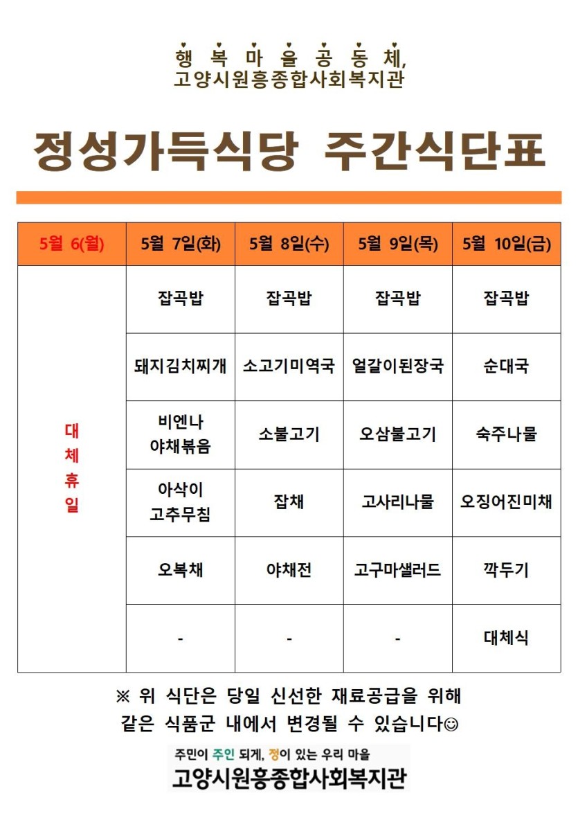 일반 5월 1째주 정성가득식당 식단 안내 페이지 정보 작성자 관리자 댓글 0건 조회1,817회 작성일 24-05-03 13:07 목록 본문 이전글직원(팀장) 채용 공고 24.05.08 다음글7월 4째주 정성가득식당 식단 안내 24.07.19 댓글 0개 댓글목록 등록된 댓글이 없습니다.