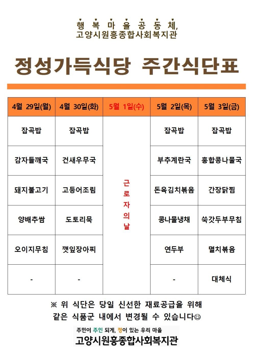 일반 4월 5째주 정성가득식당 식단 안내 페이지 정보 작성자 관리자 댓글 0건 조회1,830회 작성일 24-04-25 18:38 목록 본문 이전글2024년 고양시원흥종합사회복지관 제1차 추가경정예산 공고 24.03.26 다음글2024년 평생교육 어르신 프로그램(하모니카) 강사 최종합격자 공지 24.04.23 댓글 0개 댓글목록 등록된 댓글이 없습니다.