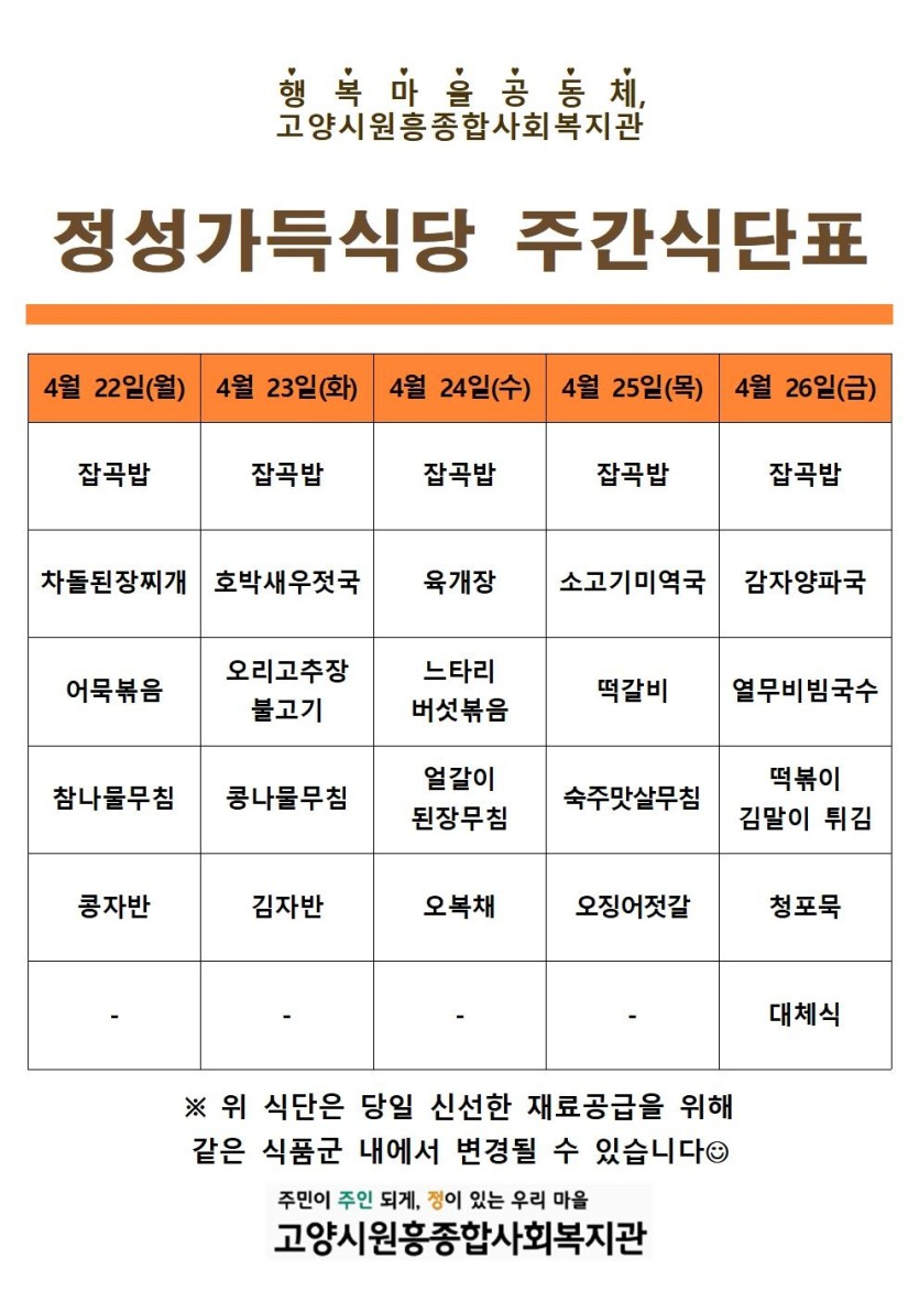 일반 4월 4째주 정성가득식당 식단 안내 페이지 정보 작성자 관리자 댓글 0건 조회1,778회 작성일 24-04-17 15:53 목록 본문 이전글2024년 가정의 달 'Bravo! Heungdo Life!-도래울 흥난DAY'안내 24.04.23 다음글4월 1째주 정성가득식당 식단 안내 24.04.01 댓글 0개 댓글목록 등록된 댓글이 없습니다.
