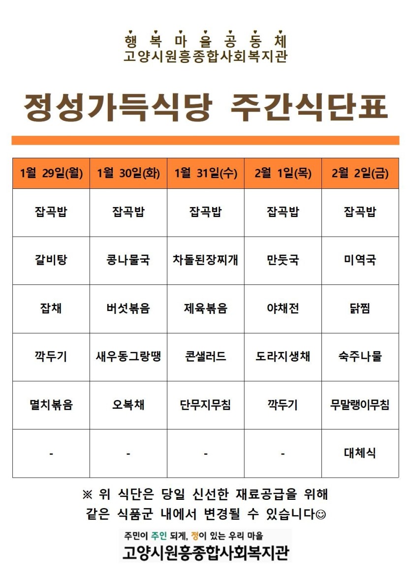 일반 1월 5째주 정성가득식당 식단 안내 페이지 정보 작성자 관리자 댓글 0건 조회1,823회 작성일 24-01-24 13:45 목록 본문 이전글2월 1째주 정성가득식당 식단 안내 24.01.31 다음글7월 5째주 정성가득식당 식단 안내 24.07.26 댓글 0개 댓글목록 등록된 댓글이 없습니다.