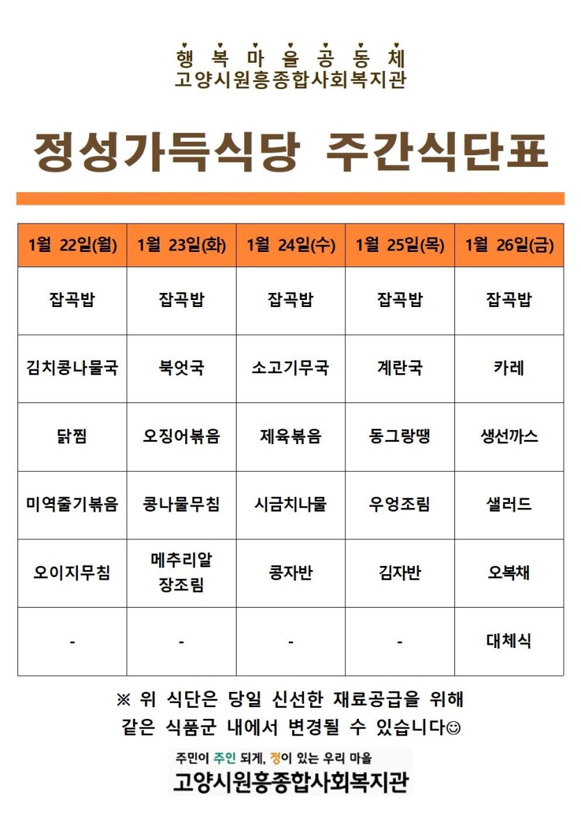 일반 1월 4째주 정성가득식당 식단 안내 페이지 정보 작성자 관리자 댓글 0건 조회1,791회 작성일 24-01-17 16:41 목록 본문 이전글2023년 제 4차 운영위원회 회의록 공고 23.12.28 다음글1월 3째주 정성가득식당 식단 안내 24.01.15 댓글 0개 댓글목록 등록된 댓글이 없습니다.