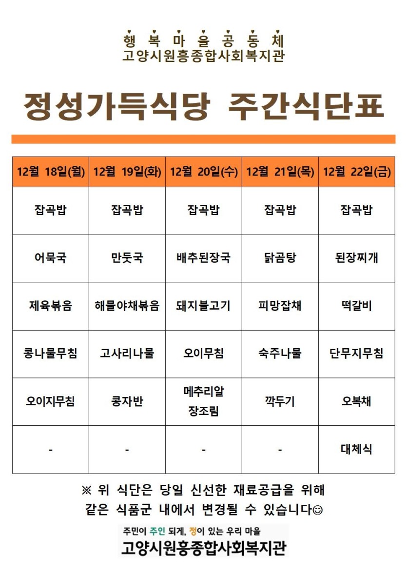 일반 12월 3째주 정성가득식당 식단 안내 페이지 정보 작성자 관리자 댓글 0건 조회1,764회 작성일 23-12-14 19:54 목록 본문 이전글직원채용 서류전형 합격자 공지 23.12.18 다음글3월 2째주 정성가득식당 식단 안내 24.03.07 댓글 0개 댓글목록 등록된 댓글이 없습니다.