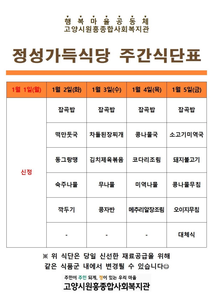 일반 1월 1째주 정성가득식당 식단 안내 페이지 정보 작성자 관리자 댓글 0건 조회1,755회 작성일 23-12-29 13:27 목록 본문 이전글1월 2째주 정성가득식당 식단 안내 24.01.05 다음글12월 4째주 정성가득식당 식단 안내 23.12.29 댓글 0개 댓글목록 등록된 댓글이 없습니다.