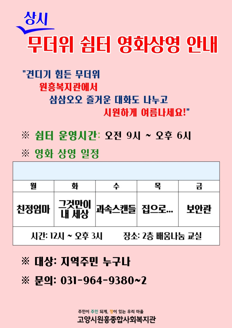 원흥종합사회복지관에서는 지역주민 모두를 위한 무더위 쉼터를 7월 31일 ~ 8월 11일 까지 2주간 운영할 예정입니다. 12시에서 오후 3시는 관내 2층의 배움나눔 교실에서 영화를 상영중이니, 지역주민분들의 많은 관심 부탁드립니다.^^