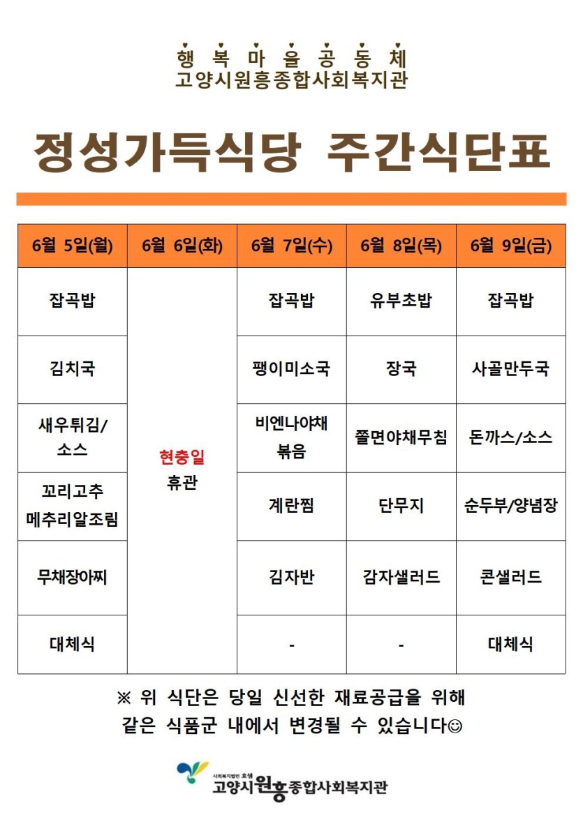 일반 6월 1째주 정성가득식당 식단 안내 페이지 정보 작성자 관리자 댓글 0건 조회1,726회 작성일 23-06-05 09:14 목록 본문 이전글2023 어르신 열린 체육교실 개강 안내 23.06.07 다음글직원(취사원) 채용 공고 23.05.31 댓글 0개 댓글목록 등록된 댓글이 없습니다.