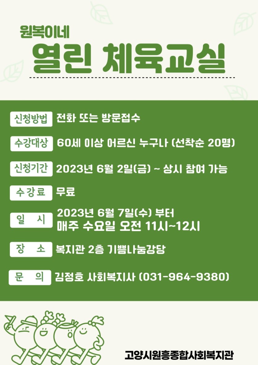 어르신 열린 체육교실은 상시 참여가 가능합니다. 지역주민 여러분의 많은 관심 부탁드립니다.